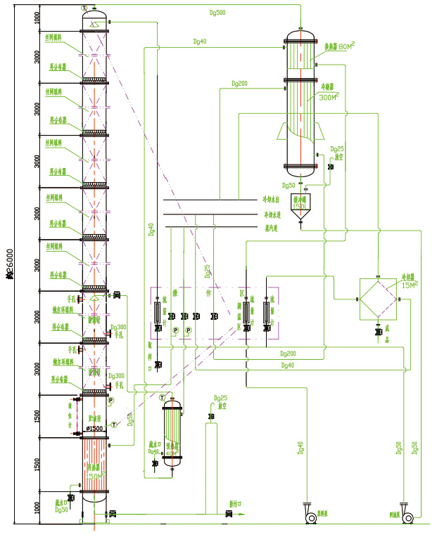 本装置适用于制药、食品、轻工、化工等行业的稀酒精回收。也适用于甲醇等其他溶煤的蒸馏。本装置根据用户的需要,可根据30℃左右的稀酒精蒸馏至90℃-95℃酒精,成品酒精度数要求再高,可以加大回流比,但产量就相应减少。